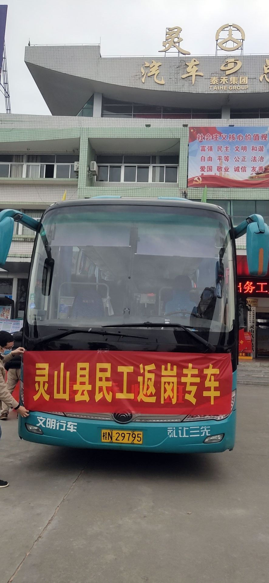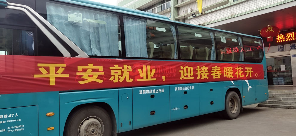 2月25日,為進一步解決人員到崗不足問題,除科室人員利用休息時間支援一線外,在總裁王咸車的統(tǒng)籌安排下,又組織人力資源部和分廠員工5人招聘小組前往廣西橫縣、靈山等人口大縣開專車接員工返回和現(xiàn)場招聘新員工工作。